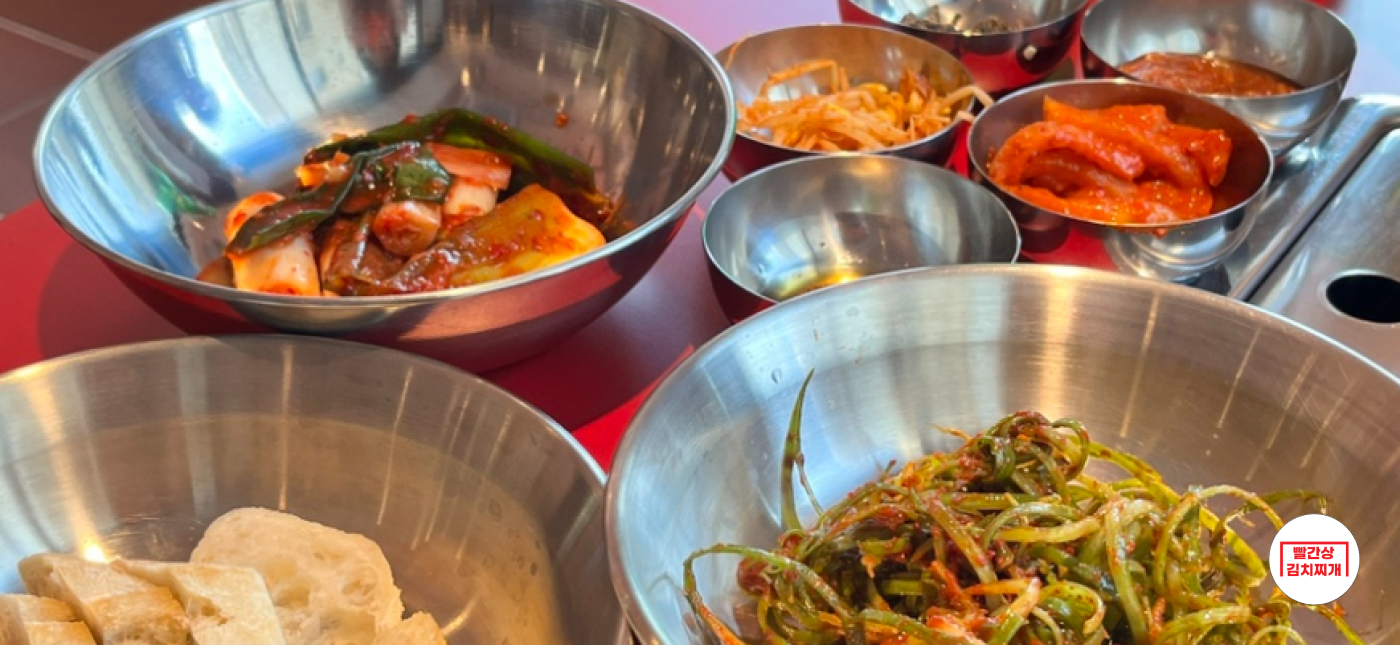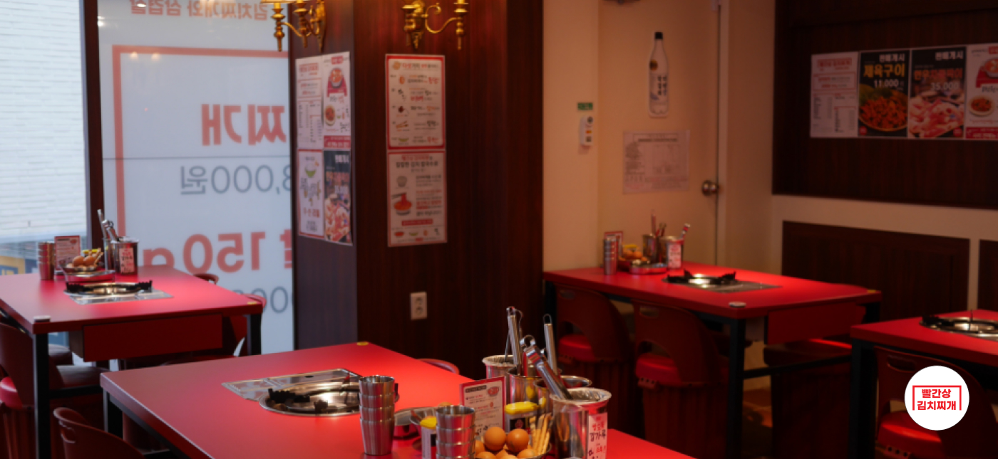 모든 테이블이 김치찌개와 같은 빨간색으로 통일하여 식욕을 돋게하고 재미있고 아기자기한 인테리어로 젊은 김치찌개집을 만들었습니다.